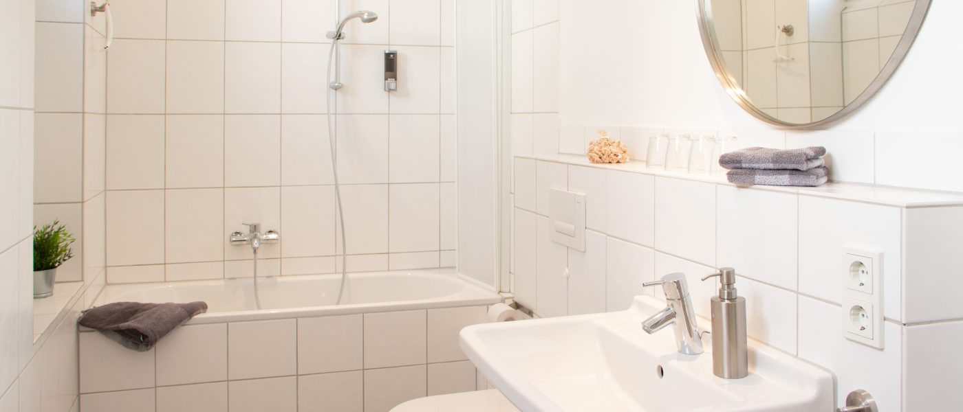 Das Badezimmer ist mit Badewanne mit Duschgelegenheit, Toilette, einem großen Waschbecken, viel Ablagefläche, Föhn, frischen Handtücher (im Preis inklusive), Seife, Shampoo und Toilettenpapier ausgestattet.