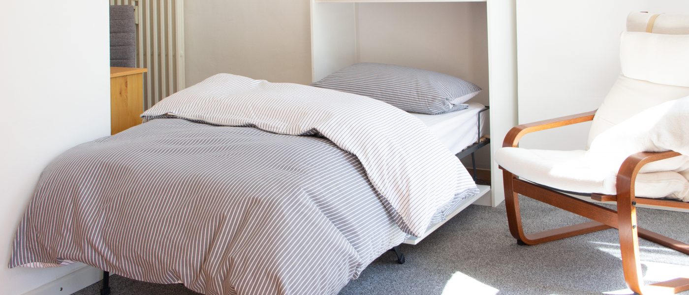 Werden mehr als 4 Schlafplätze benötigt, so kann die 5. Person im fast unsichtbaren Bett im Wohnzimmer-Separee schlafen, das tagsüber zum Schrank umfunktioniert werden kann. Das komfortable Schlafsofa (ca. 1,40 m x 2,00 m) kann bei Bedarf für den 6. und 7. Gast zum Doppelbett umfunktioniert werden. Natürlich kann das Wohnzimmer am Tag durch alle Bewohner genutzt werden, denn dank des praktischen Bettkastens, kann das Bettzeug des Sofas hier einfach verstaut werden.